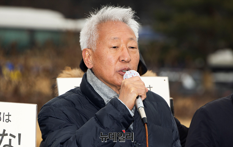 류석춘 전 연세대학교 교수가 4일 오후 서울 종로구 청와대 앞에서 열린 위안부법폐지운동본부 활동을 비판한 이재명 대통령에게 사과를 요구하는 기자회견에서 발언하고 있다.