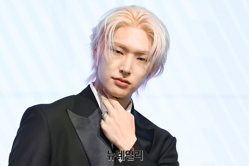 그룹 에이티즈(ATEEZ) 민기가 5일 오후 서울 여의도 페어몬트 앰배서더 서울에서 열린 미니 13집 앨범 'GOLDEN HOUR : Part.4' 기자간담회에서 포즈를 취하고 있다.