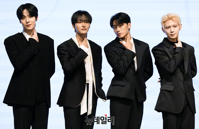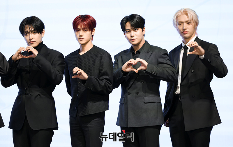 그룹 에이티즈(ATEEZ) 홍중, 성화, 윤호, 여상, 산, 민기, 우영, 종호가 5일 오후 서울 여의도 페어몬트 앰배서더 서울에서 열린 미니 13집 앨범 'GOLDEN HOUR : Part.4' 기자간담회에서 포즈를 취하고 있다.