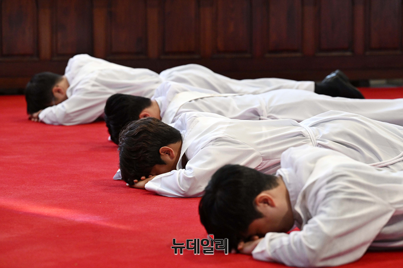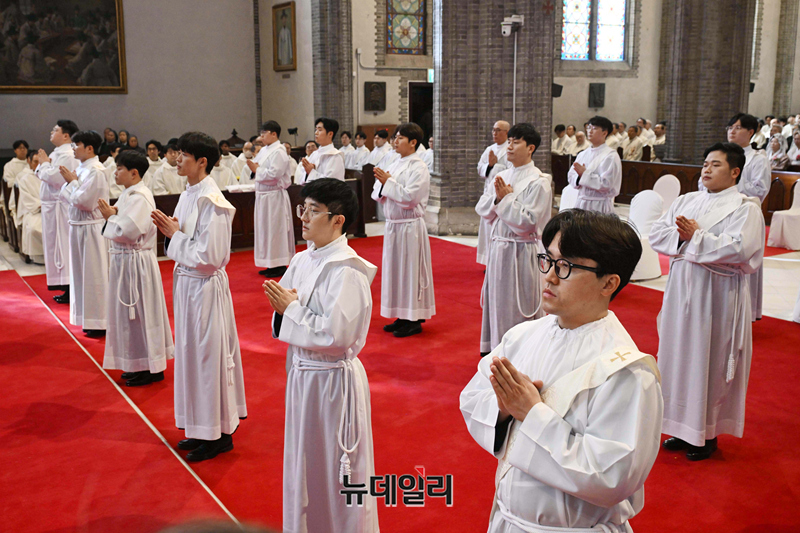 2026년 천주교 서울대교구 사제 서품식이 열린 6일 서울 중구 명동대성당에서 사제 수품자들이 서품 기도를 하고 있다. (사진=공동취재단)