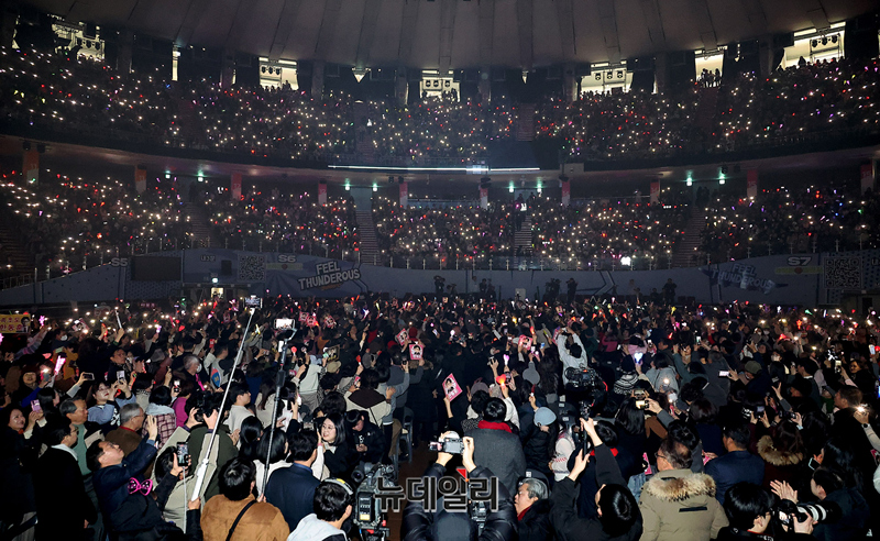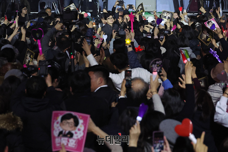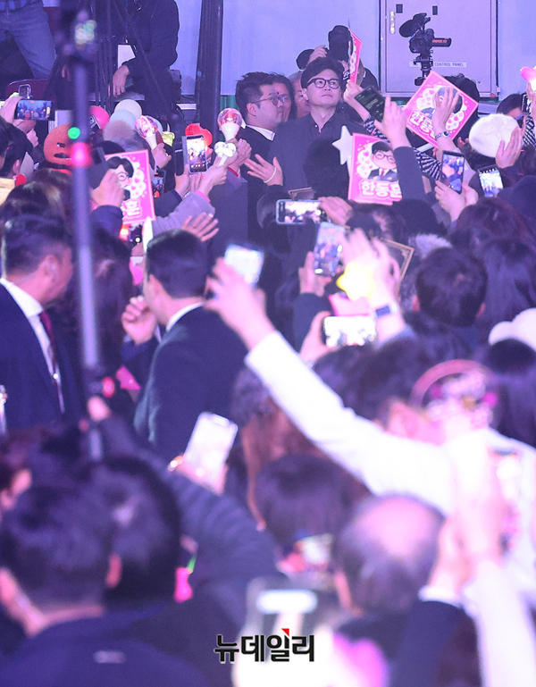 한동훈 전 국민의힘 대표가 8일 오후 서울 송파구 잠실실내체육관에서 열린 토크콘서트에 지지자들의 환호를 받으며 입장하고 있다.