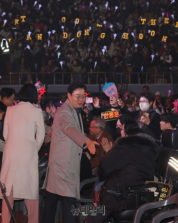김성원 국민의힘 의원이 8일 오후 서울 송파구 잠실실내체육관에서 열린 한동훈 전 국민의힘 대표 토크콘서트에 입장하며 인사를 나누고 있다.