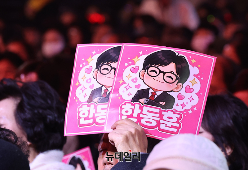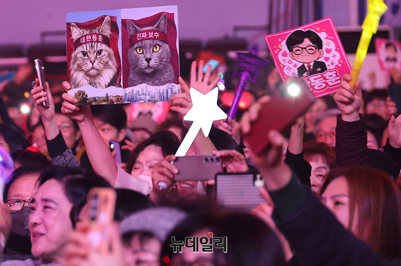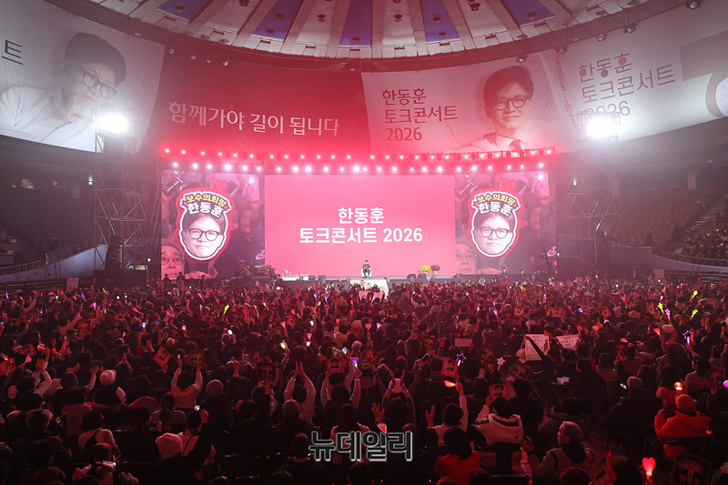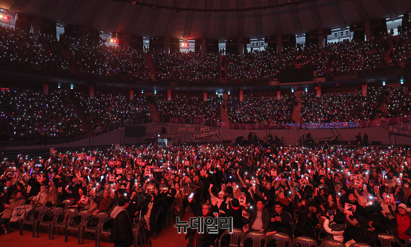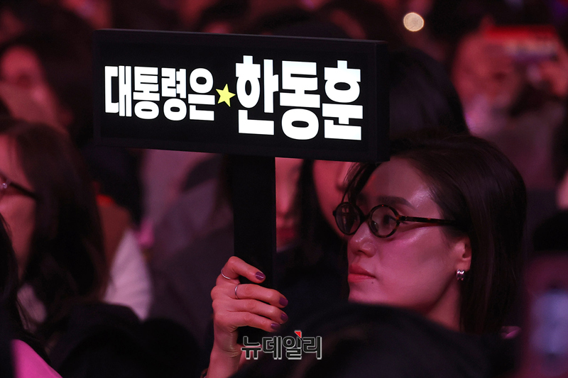 한동훈 전 국민의힘 대표의 토크콘서트가 8일 오후 서울 송파구 잠실실내체육관에서 열린 가운데 지지자들이 응원봉과 손피켓을 들고 한 대표를 맞이하고 있다.