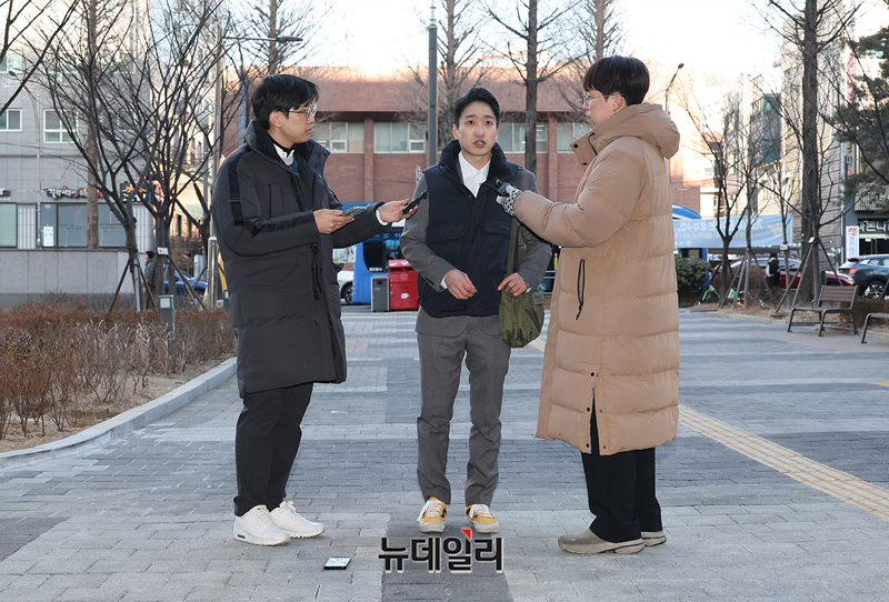 이상욱 정의당 강서구위원장이 9일 오전 서울 강서경찰서에 고발인 조사를 위해 출석하며 취재진 질문에 답하고 있다.