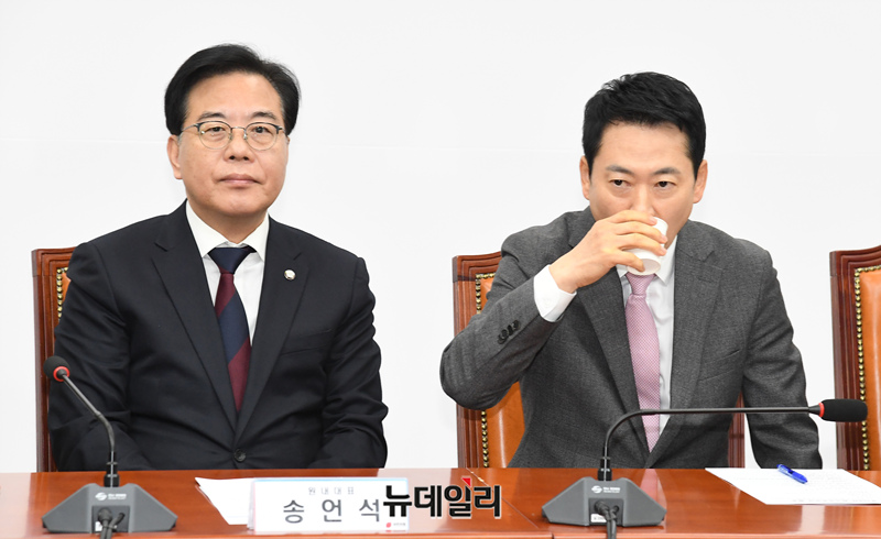 장동혁 국민의힘 대표가 9일 오전 국회에서 열린 최고위원회의에서 물을 마시고 있다.
