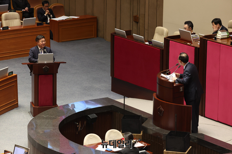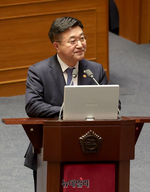 윤호중 행정안전부 장관이 9일 국회에서 열린 본회의 정치·외교·통일·안보 분야 대정부질문에서 의원 질의에 답하고 있다.