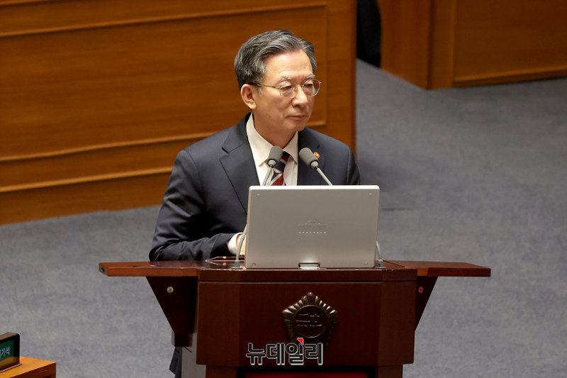 정성호 법무부 장관이 9일 국회에서 열린 본회의 정치·외교·통일·안보 분야 대정부질문에서 의원 질의에 답하고 있다.
