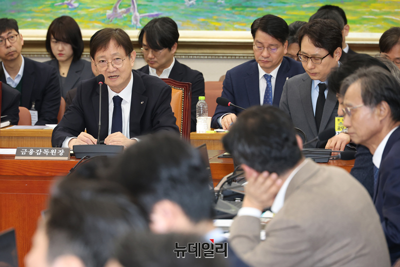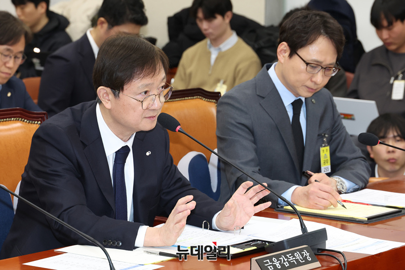 이찬진 금융감독원장이 11일 국회에서 열린 정무위원회의 빗썸 관련 긴급 현안질의에서 의원 질의에 답하고 있다.