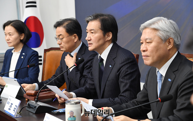 조국 조국혁신당 대표가 12일 오전 국회에서 열린 최고위원회의에서 모두발언을 하고 있다.