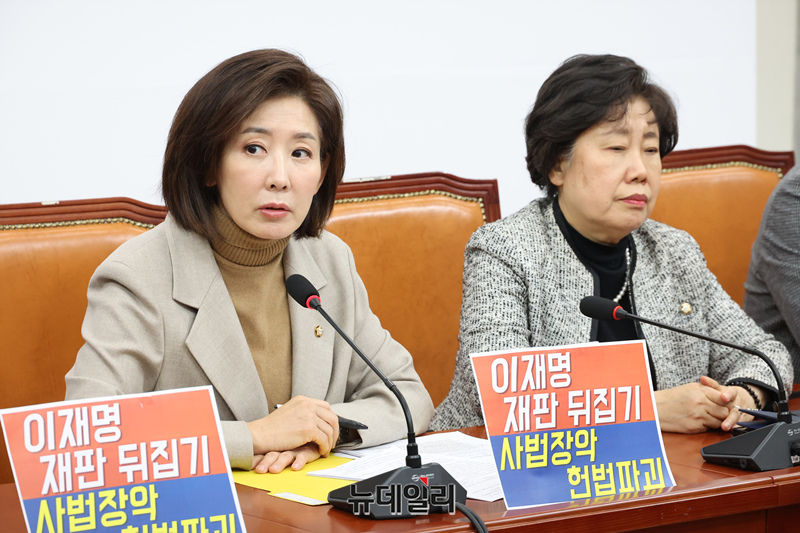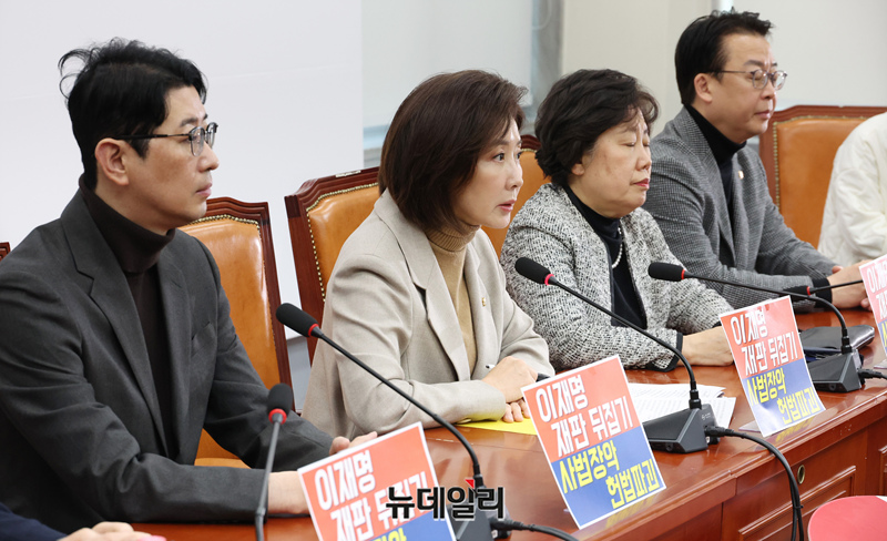 나경원 국민의힘 의원 및 법제사법위원회 위원들이 12일 오전 국회에서 '여당 주도 대법관 증원·재판소원법 법사위 통과'를 규탄하는 기자간담회를 하고 있다.
