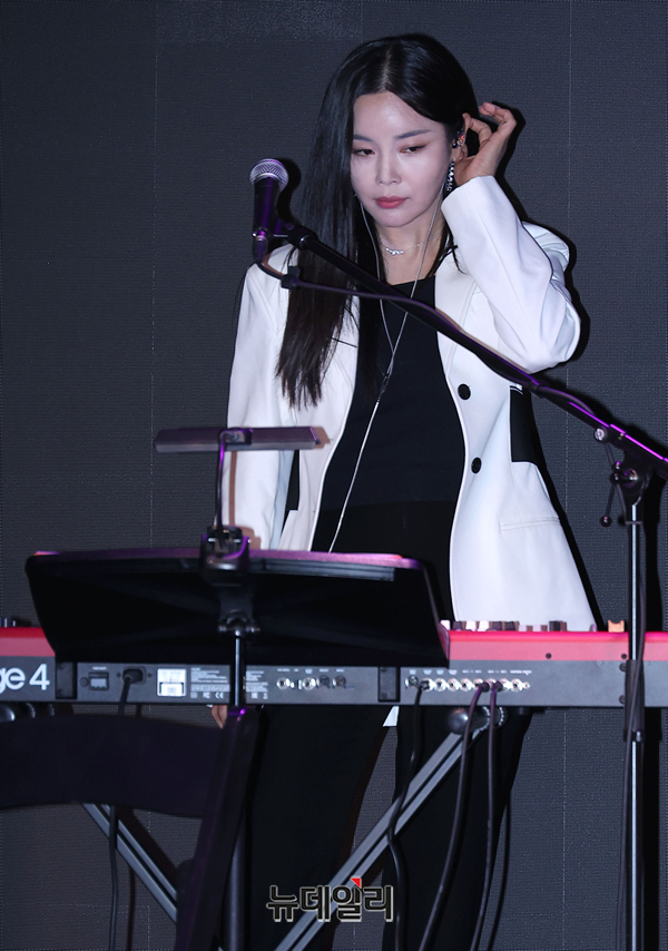 아묻따밴드 조정민이 12일 오후 서울 종로구 대학로 SA홀에서 열린 첫 디지털 싱글 발매기념 쇼케이스에서 키보드 연주를 하고 있다.