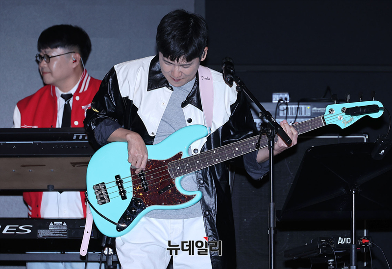 아묻따밴드 리더 가수 홍경민이 12일 오후 서울 종로구 대학로 SA홀에서 열린 첫 디지털 싱글 발매기념 쇼케이스에서 연주를 하며 열창하고 있다.KBS 2TV 불후의명곡 신년기획 2026 배우 특집에서 우승을 거머쥐며 화제를 모은 아묻따 밴드는 이날 첫 싱글 '알고 있잖아'를 발매하며 정식으로 데뷔했다.밴드는 홍경민(리더, 베이스) 조영수(키보드) 차태현(객원보컬) 전인혁(기타) 김준현(드럼) 조정민(피아노)으로 구성된 팀이다. 음원은 오후 6시 공개.