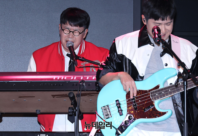아묻따밴드 작곡가 조영수가 12일 오후 서울 종로구 대학로 SA홀에서 열린 첫 디지털 싱글 발매기념 쇼케이스에서 연주를 하며 열창하고 있다.KBS 2TV 불후의명곡 신년기획 2026 배우 특집에서 우승을 거머쥐며 화제를 모은 아묻따 밴드는 이날 첫 싱글 '알고 있잖아'를 발매하며 정식으로 데뷔했다.밴드는 홍경민(리더, 베이스) 조영수(키보드) 차태현(객원보컬) 전인혁(기타) 김준현(드럼) 조정민(피아노)으로 구성된 팀이다. 음원은 오후 6시 공개.