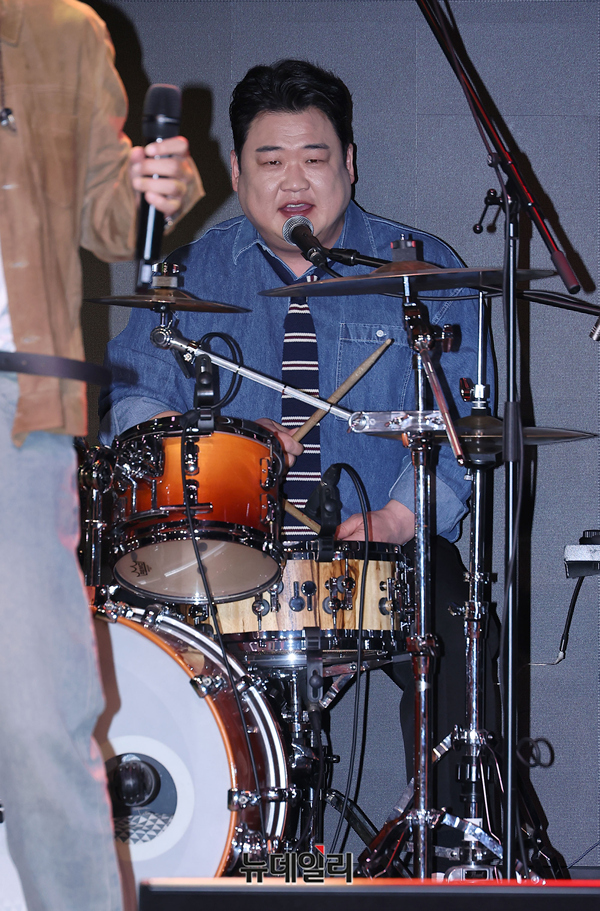 아묻따밴드 개그맨 김준현이 12일 오후 서울 종로구 대학로 SA홀에서 열린 첫 디지털 싱글 발매기념 쇼케이스에서 드럼연주를 하고 있다.KBS 2TV 불후의명곡 신년기획 2026 배우 특집에서 우승을 거머쥐며 화제를 모은 아묻따 밴드는 이날 첫 싱글 '알고 있잖아'를 발매하며 정식으로 데뷔했다.밴드는 홍경민(리더, 베이스) 조영수(키보드) 차태현(객원보컬) 전인혁(기타) 김준현(드럼) 조정민(피아노)으로 구성된 팀이다. 음원은 오후 6시 공개.