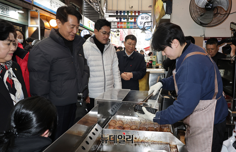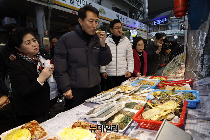 오세훈 서울시장이 설 연휴를 앞둔 13일 오후 서울 광진구 자양전통시장을 방문해 명절 음식을 맛보고 있다.