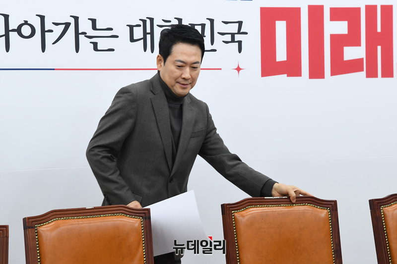 장동혁 국민의힘 대표 및 지도부가 19일 오전 국회에서 열린 최고위원회의에 참석하고 있다.