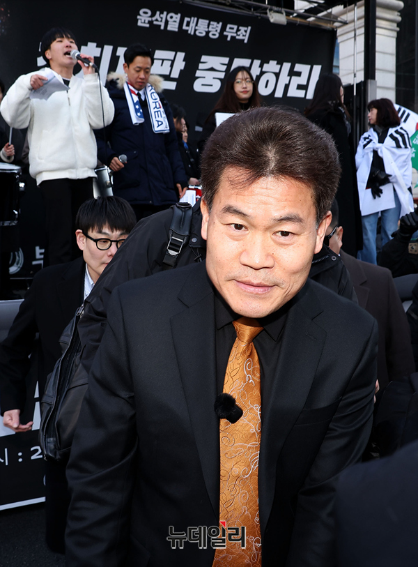 전한길 전 한국사 강사가 12·3 비상계엄과 관련해 내란 우두머리 혐의로 기소된 윤석열 전 대통령 1심 선고 공판을 앞둔 19일 오후 서울 서초구 서울중앙지법 인근에서 열린 무죄촉구 집회에 참석하고 있다.