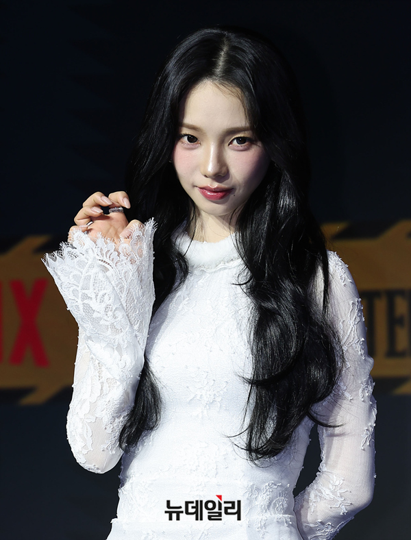 에스파 카리나가 19일 오전 서울 마포구 호텔 나루 서울에서 열린 넷플릭스 새 예능 '미스터리 수사단 시즌2' 제작발표회에서 포즈를 취하고 있다.