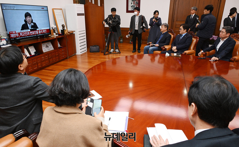 우원식 국회의장이 19일 국회 의장실에서 12·3 비상계엄 관련 내란 우두머리 혐의를 받는 윤석열 전 대통령의 1심 선고 공판 생중계를 시청하고 있다.