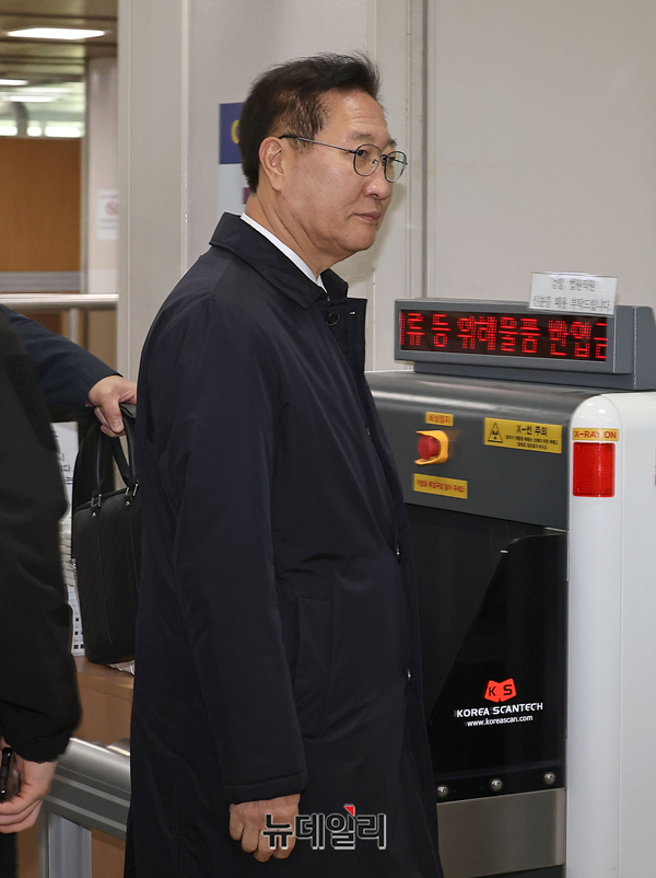 내란중요임무종사 등 혐의를 받고 있는 박성재 전 법무부 장관이 23일 오전 서울 서초구 서울중앙지법에서 열린 3차 공판에 출석해 법정 입장 전 검색을 받고 있다.
