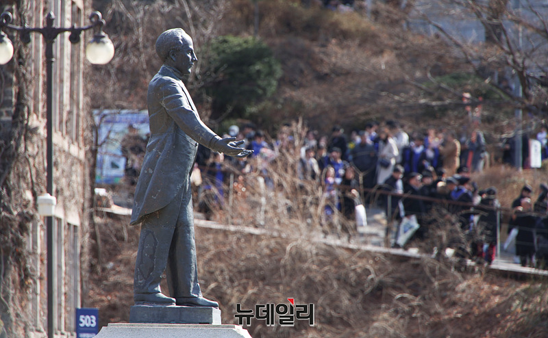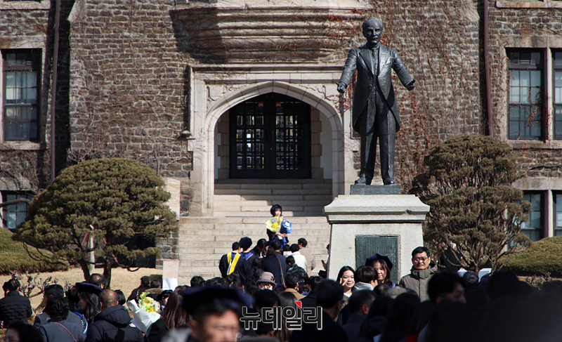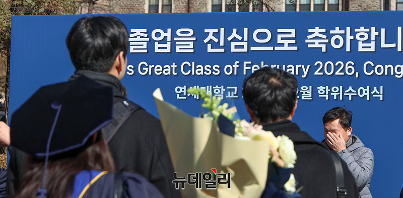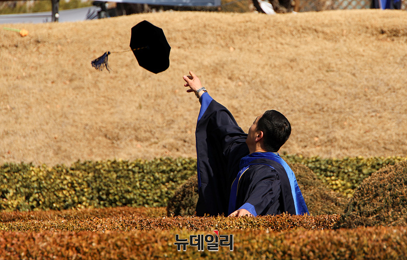 연세대학교 2026년 2월 학위수여식이 열린 23일 오전 서울 서대문구 연세대학교 서울캠퍼스에서 졸업생들이 학사모를 하늘로 던지며 기념촬영을 하고 있다.