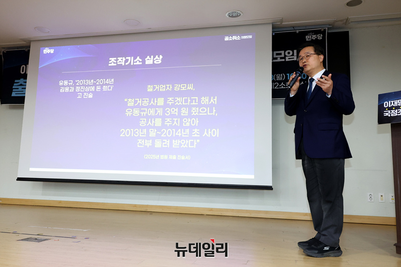 이건태 이재명 대통령 사건 공소취소와 국정조사 추진을 위한 의원모임 간사가 23일 오전 국회 의원회관에서 열린 모임 출범식 및 결의대회에서 모임을 소개하고 있다.