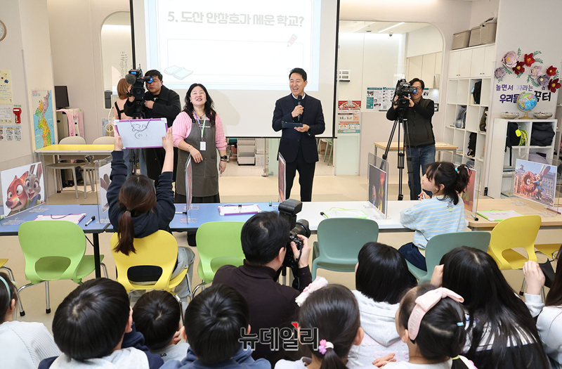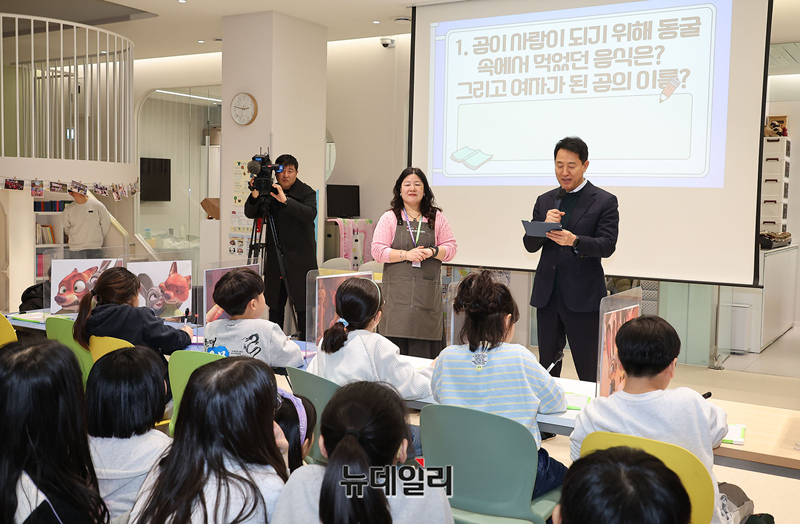 오세훈 서울시장이 23일 오후 서울 동작구 사당동 우리동네키움센터 동작 13호점을 방문해 독서골든벨 프로그램에 참여하고 있다.
