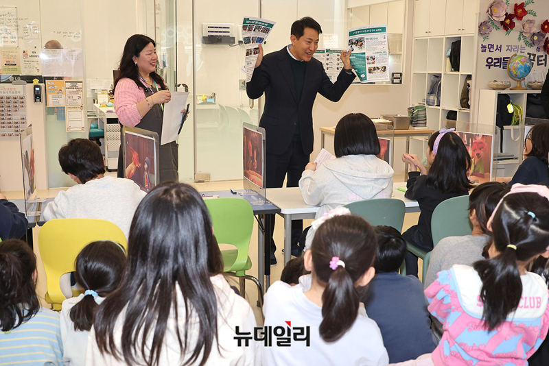 오세훈 서울시장이 23일 오후 서울 동작구 사당동 우리동네키움센터 동작 13호점을 방문해 아이들이 직접 제작한 소식지를 선물받고 살펴보고 있다.