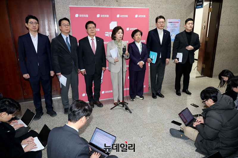 [포토] 개의 지연 관련 입장 밝히는 국민의힘 법사위원들