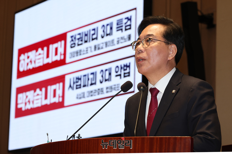 송언석 국민의힘 원내대표가 24일 오전 국회에서 열린 의원총회에서 모두발언을 하고 있다.