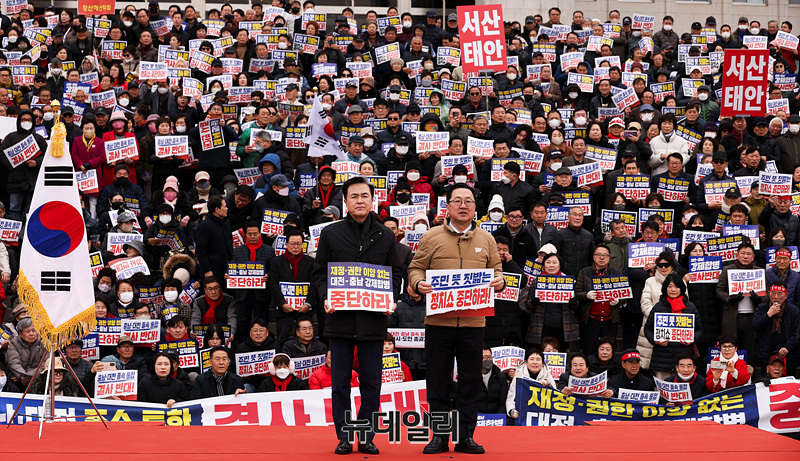 김태흠 충남도지사와 이장우 대전시장이 24일 오후 서울 여의도 국회 본관 계단에서 열린 대전·충남 졸속 통합 반대 범시·도민 총궐기대회에서 규탄문구가 적힌 손피켓을 들고 있다.