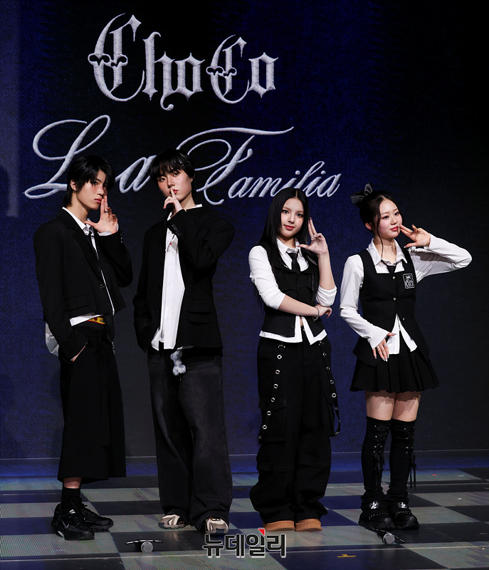 그룹 '초코(ChoCo)' 예찬, 태조, 안판, 윤지가 24일 오후 서울 마포구 쇼킹케이팝센터에서 열린 첫 패밀리 앨범 '초코 라 파밀리아(ChoCo La Familia)' 발매 기념 쇼케이스에서 포즈를 취하고 있다.