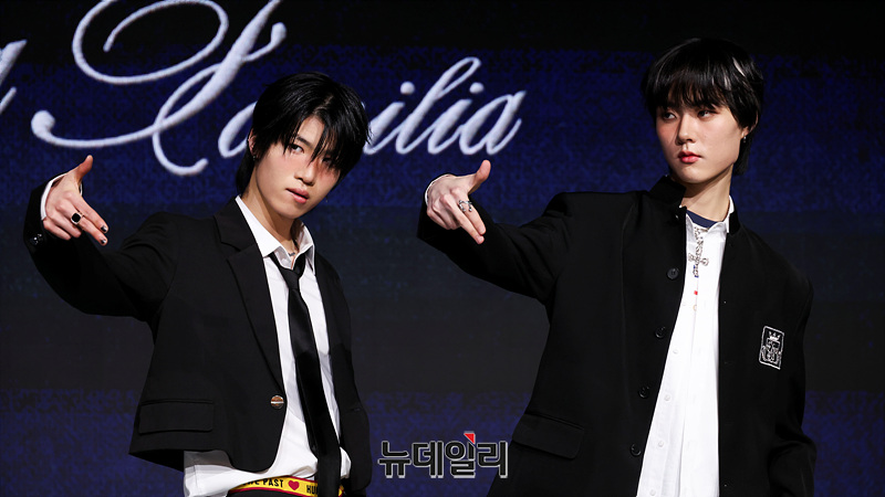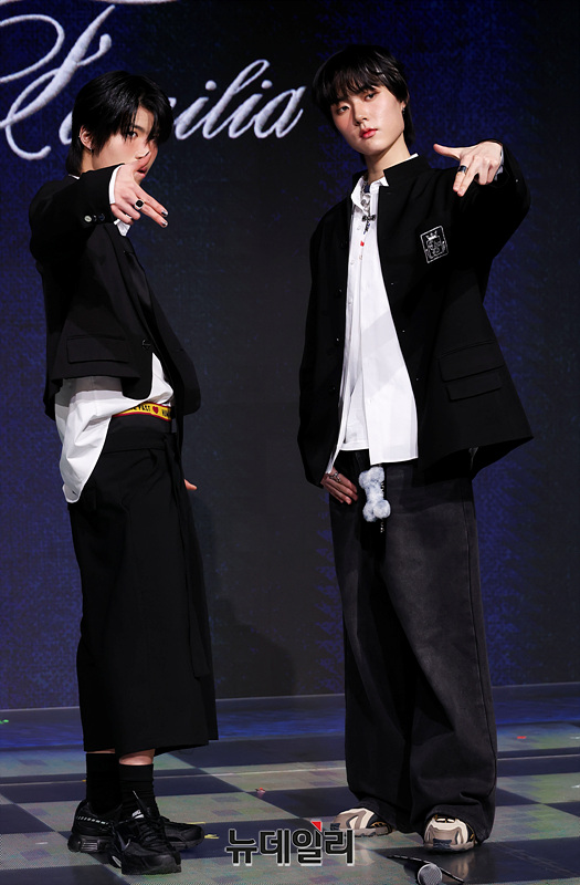 그룹 '초코(ChoCo)'의 유닛 초코1(Choco1) 예찬, 태조가 24일 오후 서울 마포구 쇼킹케이팝센터에서 열린 첫 패밀리 앨범 '초코 라 파밀리아(ChoCo La Familia)' 발매 기념 쇼케이스에서 포즈를 취하고 있다.이번 앨범에는 더블 타이틀곡 '깁미(GIMME)'와 '프렌지(FRENZY)'를 비롯해 '왓츠 유얼 위시(What’s Your Wish)' '짠(ZZAN)' '온 더 스트릿(On The Street)까지 총 다섯 곡을 담았다.