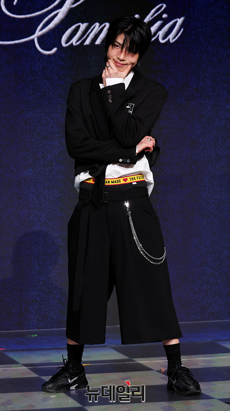 그룹 '초코(ChoCo)' 예찬이 24일 오후 서울 마포구 쇼킹케이팝센터에서 열린 첫 패밀리 앨범 '초코 라 파밀리아(ChoCo La Familia)' 발매 기념 쇼케이스에서 포즈를 취하고 있다.