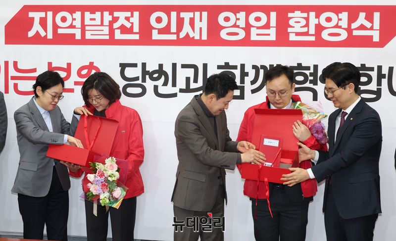 장동혁 국민의힘 대표가 25일 오전 국회에서 열린 인재영입위원회 영입인재 환영식에서 손정화 회계사와 정진우 원전엔지니어 에게 시크릿박스를 전달하고 있다.