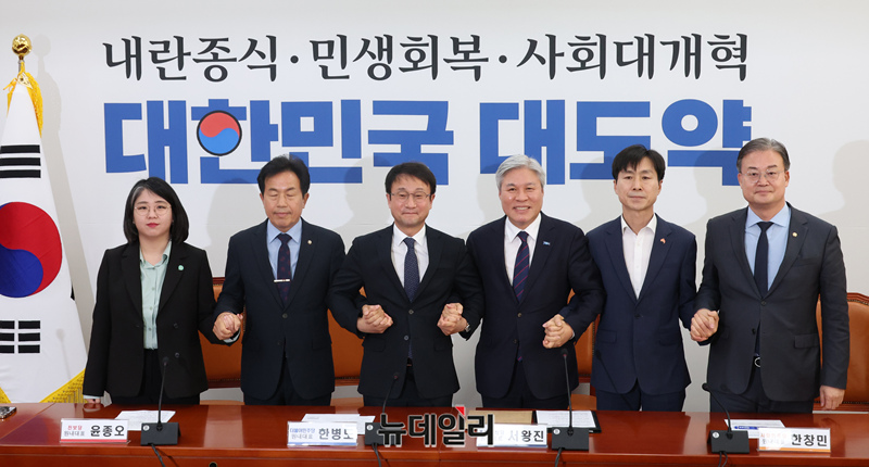 한병도 더불어민주당 원내대표가 25일 오전 국회에서 열린 민주당·개혁진보4당 정치개혁 간담회에서 참석자들과 손을 잡고 기념촬영을 하고 있다. (왼쪽부터 용혜인 기본소득당 대표, 윤종오 진보당 원내대표, 한 원내대표, 서왕진 조국혁신당 원내대표, 한창민 사회민주당 대표, 이연희 민주당 전략기획위원장)