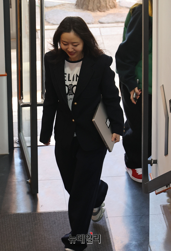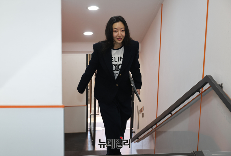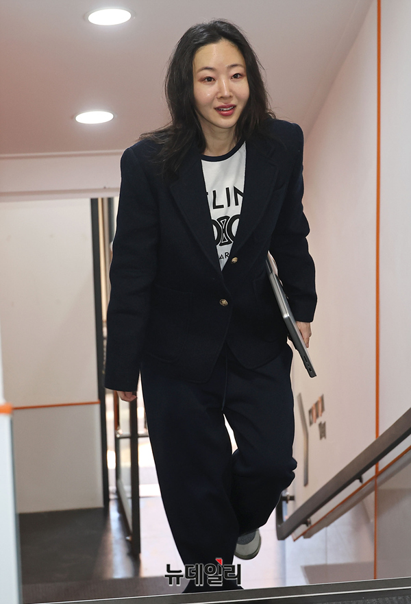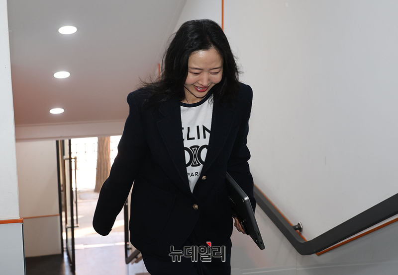 민희진(오케이 레코즈 대표) 전 어도어 대표가 25일 오후 서울 종로구 교원 챌린지홀에서 열린 하이브 풋옵션 관련 기자회견에 입장하고 있다.