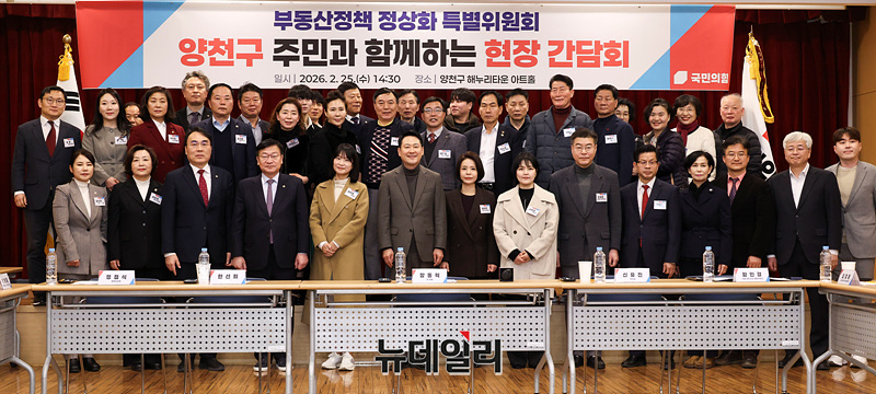 장동혁 국민의힘 대표를 비롯한 참석자들이 25일 오후 서울 양천구 해누리타운에서 열린 국민의힘 부동산정책 정상화 특별위원회 서울 부동산 현장 간담회에서 기념촬영을 하고 있다.