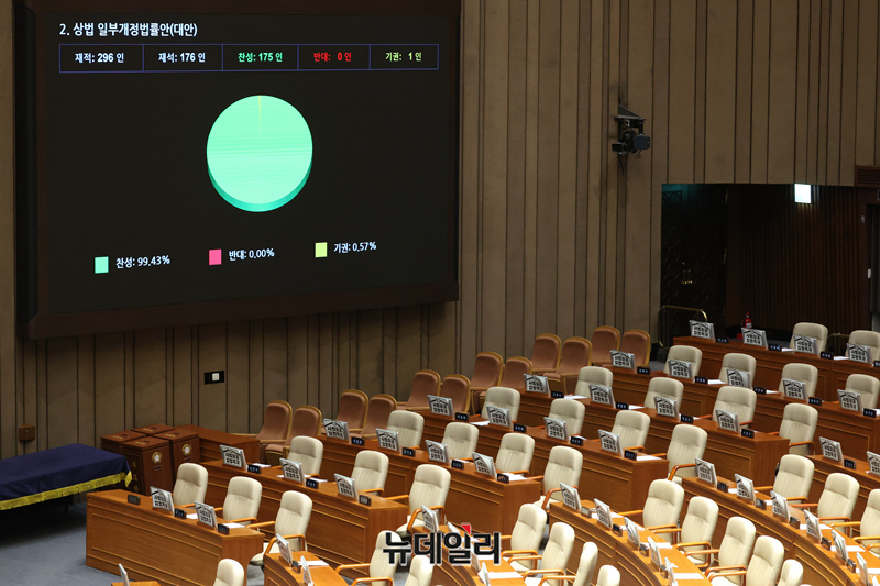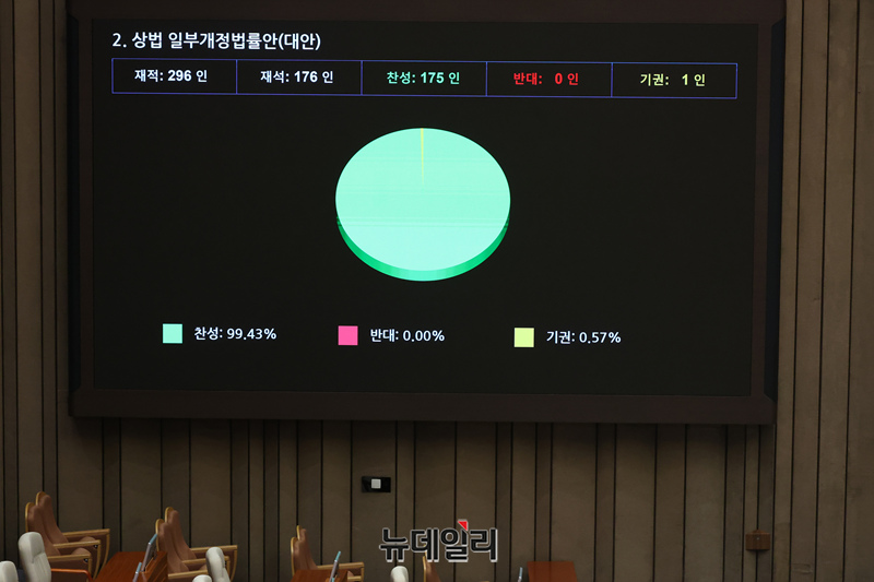 상법 일부개정법률안(대안)이 25일 국회에서 열린 본회의에서 재적296인, 재석 176인, 찬성175인, 기권 1인으로 가결되고 있다.