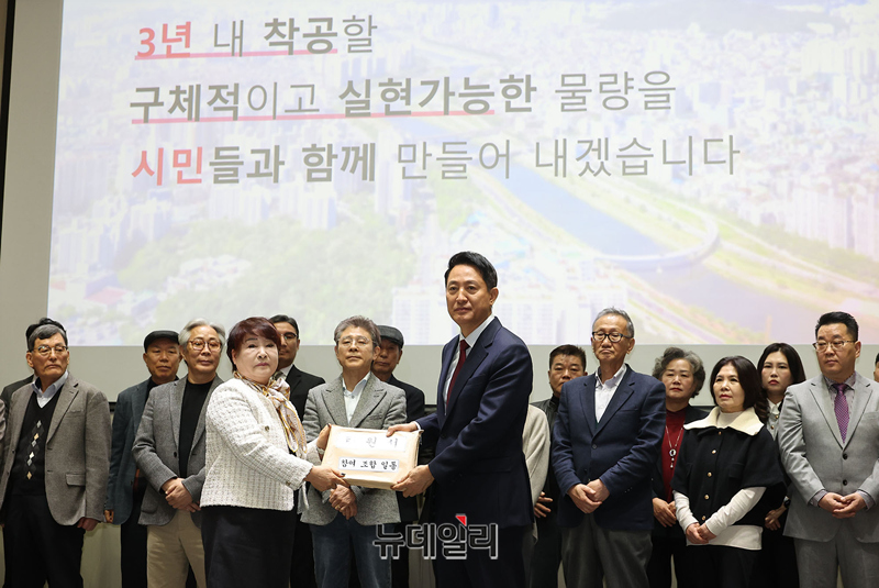 오세훈 서울시장이 26일 오전 서울시청 대회의실에서 열린 서울시 핵심공급 전략사업 발표회에서 전략사업 참여 조합장과 조합원으로 부터 탄원서를 전달받고 있다.