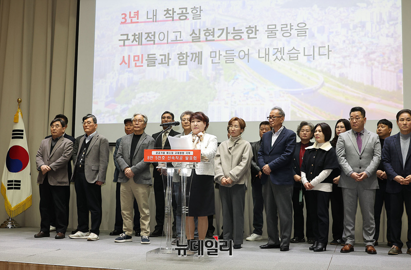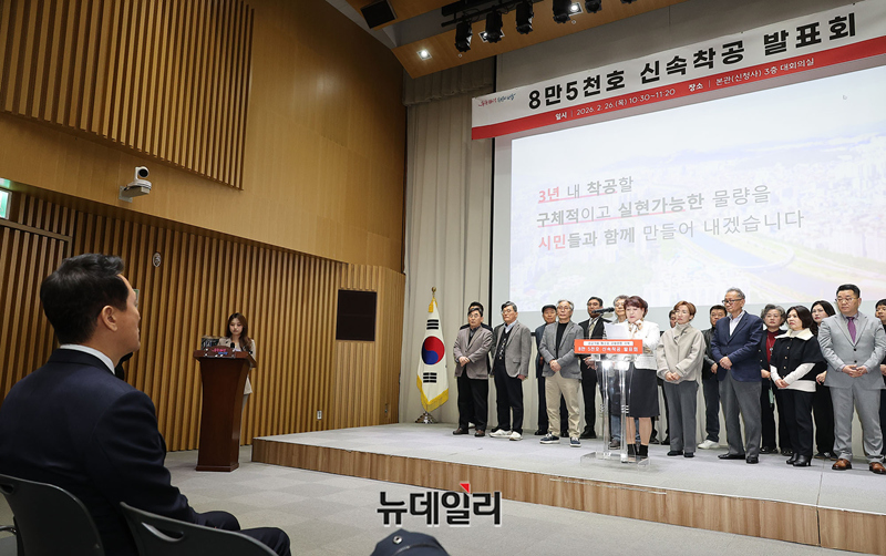 서울시 정비사업 조합장과 조합원들이 26일 오전 서울시청 대회의실에서 열린 서울시 핵심공급 전략사업 발표회에서 오세훈 시장에게 건의사항을 발표하고 있다.