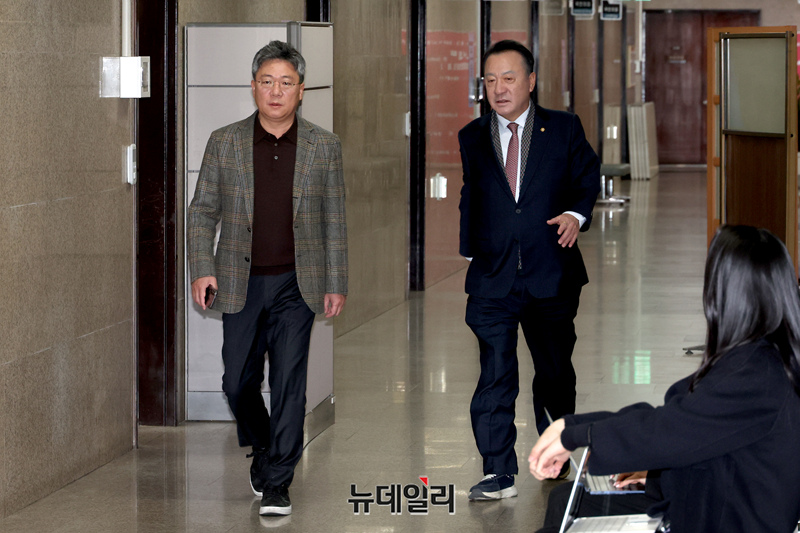 박정하·엄태영 국민의힘 의원이 26일 오후 국회에서 당내 현안 관련 재선의원 회동에 참석하고 있다.