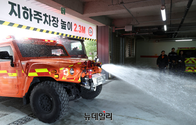 서울소방재난본부 미래형 재난대응 체계 공개 시연회가 열린 26일 오후 서울 은평구 서울소방학교에서 저상소방차가 화재 진압 시연을 하고 있다.