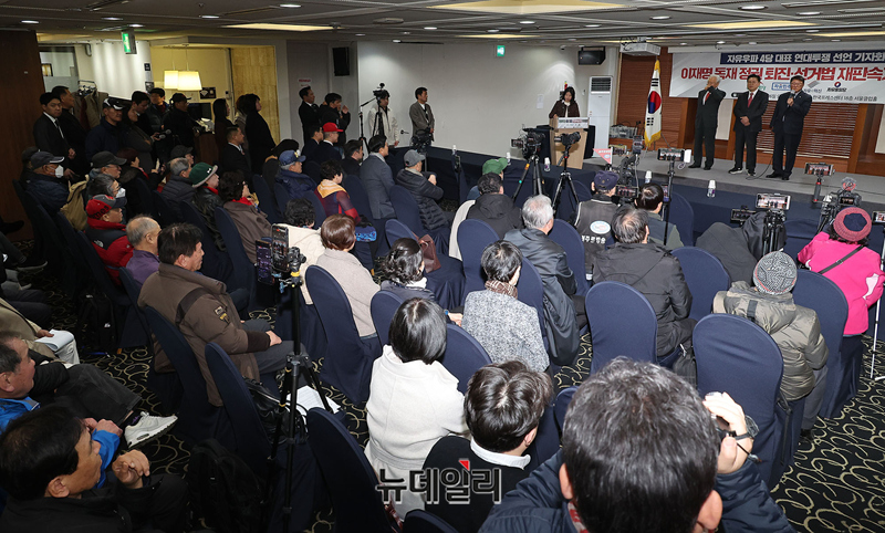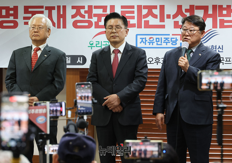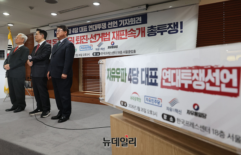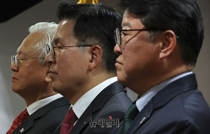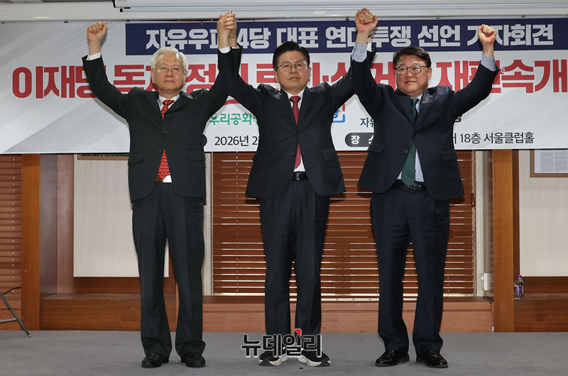 고영주 자유민주당 전 대표(왼쪽부터), 황교안 자유와혁신 대표, 조원진 우리공화당 대표가 26일 오후 서울 중구 한국프레스센터에서 열린 자유우파 4당대표 연대투쟁선언 기자회견에 참석해 자리하고 있다.이날 회견엔 조원진 우리공화당 대표, 고영주 자유민주당 변호사, 황교안 자유와혁신 대표가 참석했다. 연대투쟁에 동참하는 전광훈 자유통일당 상임고문은 구속 수감 중으로 불참했다.이들은 회견문을 통해 △독재타도 투쟁에 단일대오로 함께 할것 △이재명 공직선거법 위반 사건 파기환송심 재개 관철 △투쟁승리까지 함께 할것 등을 선언했다.