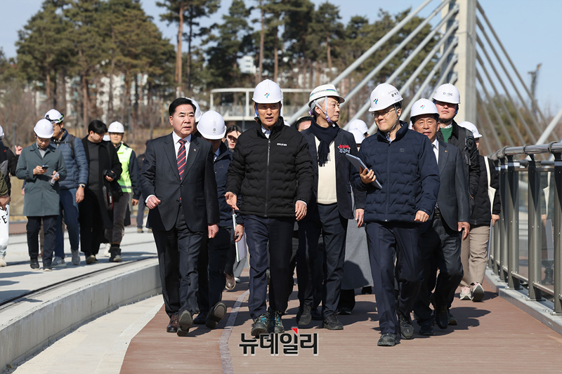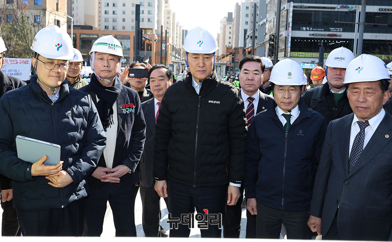 오세훈 서울시장, 서강석 송파구청장, 김근식 국민의힘 송파병 당협위원장 등이 27일 오후 서울 송파구 위례호수공원역 인근에서 위례선(트램) 건설공사 현장점검을 하고 있다.
