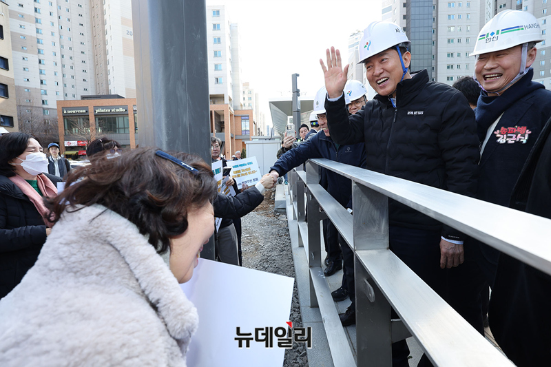 오세훈 서울시장이 27일 오후 서울 송파구 위례호수공원역 인근에서 위례선(트램) 건설공사 현장점검을 나선 가운데 위례 주민들이 환영 손피켓을 들고 오 시장을 맞이하고 있다.