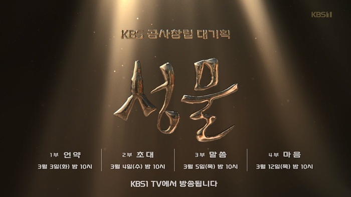 김희애의 내레이션과 함께할 '성물' 4부작은 3월 3일 밤 10시 1부 '언약' 편으로 첫 방송된다. 이후 3월 4일 밤 10시 2부 '초대', 3월 5일 밤 10시 3부 '말씀', 3월 12일 밤 10시 4부 '마음'을 KBS 1TV를 통해 선보인다. -