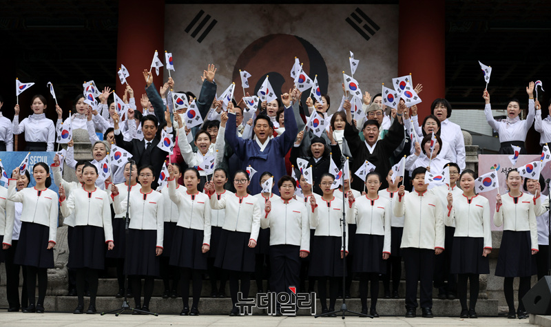 오세훈 서울시장, 최호정 서울시의회 의장, 독립유공자 후손 등을 비롯한 참석자들이 1일 오전 서울 종로구 보신각에서 열린 제107주년 3·1절 기념 타종행사에서 태극기를 들고 만세를 하고 있다.