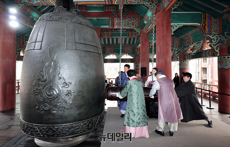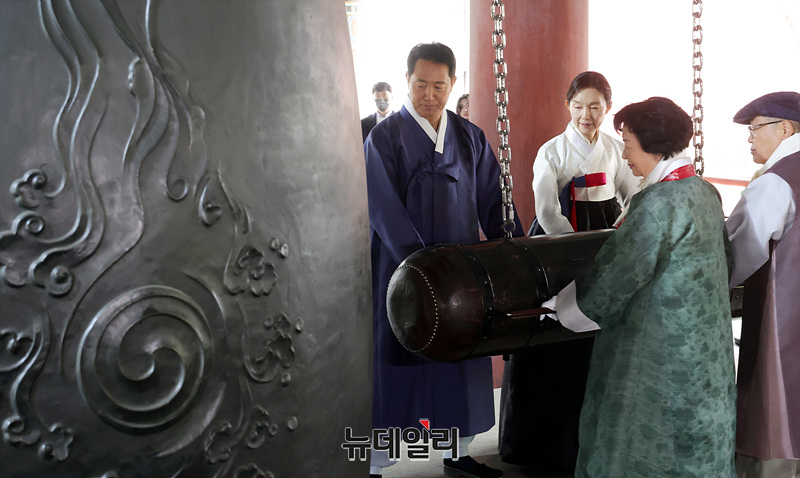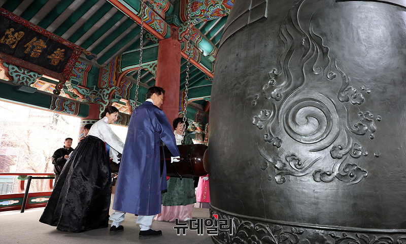 오세훈 서울시장, 최호정 서울시의회 의장, 독립유공자 후손 등을 비롯한 참석자들이 1일 오전 서울 종로구 보신각에서 열린 제107주년 3·1절 기념 타종행사에서 타종을 하고 있다.