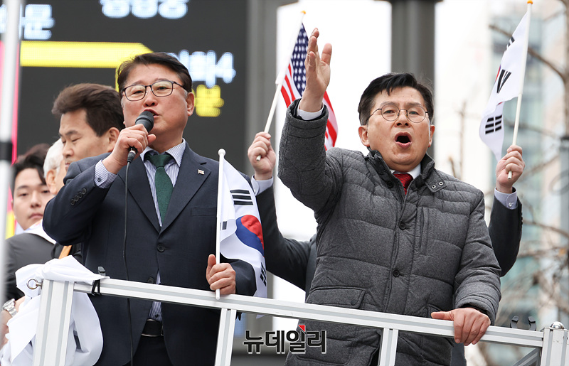 황교안 자유와혁신 대표가 1일 오후 서울 중구 세종대로에서 열린 자유우파 4당 연합집회에 참석해 자리하고 있다.